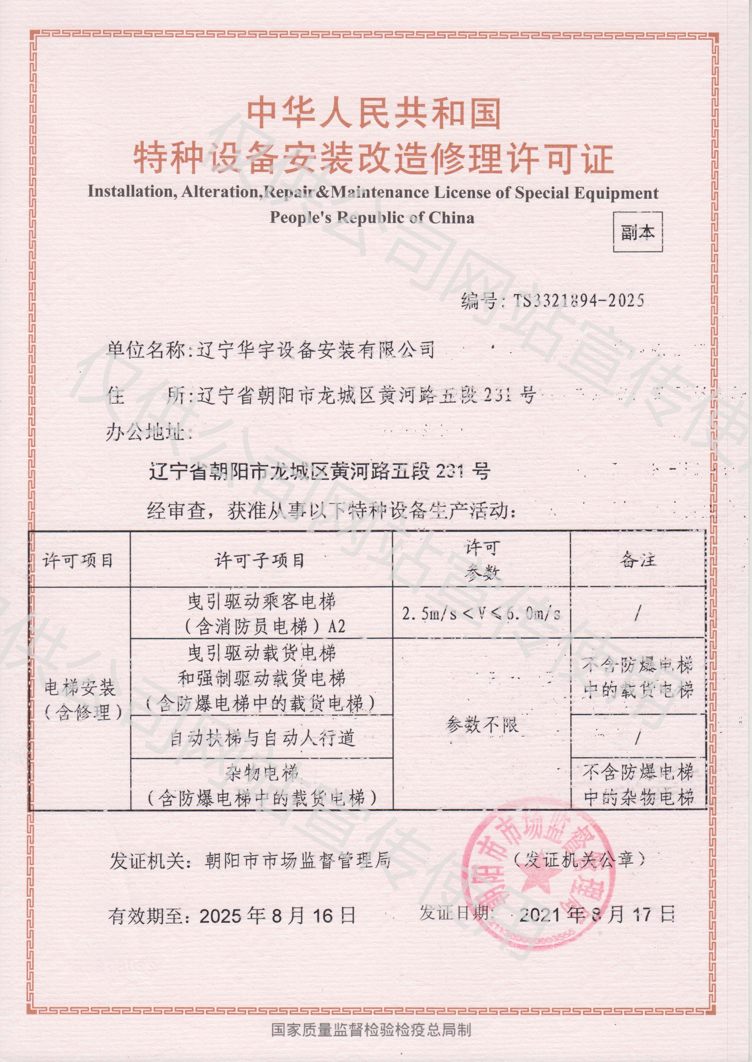 ? ? ? ?? 遼寧華宇設(shè)備安裝有限公司成立于2002年7月15日,注冊(cè)資金10000萬(wàn)。公司占地面積60余畝,建筑面積4000余平。現(xiàn)取得消防設(shè)施工程專業(yè)承包一級(jí)資質(zhì)、消防設(shè)施維護(hù)保養(yǎng)檢測(cè)一級(jí)資質(zhì)、建筑機(jī)電安裝工程專業(yè)承包一級(jí)資質(zhì)、電子與智能化專業(yè)承包二級(jí)、建筑裝修裝飾工程專業(yè)承包二級(jí)、安全技術(shù)防范設(shè)施設(shè)計(jì)施工二級(jí)資質(zhì)、建筑工程施工總承包三級(jí)、電力工程施工總承包二級(jí)、輸變電工程專業(yè)承包二級(jí)資質(zhì)、電力承裝、承修、承試三級(jí)資質(zhì)、鋼結(jié)構(gòu)工程專業(yè)承包三級(jí)資質(zhì)和地基基礎(chǔ)工程專業(yè)承包三級(jí)。同時(shí)是人防工程通風(fēng)(防化)設(shè)備生產(chǎn)安裝企業(yè),并具備電梯銷售、電梯安